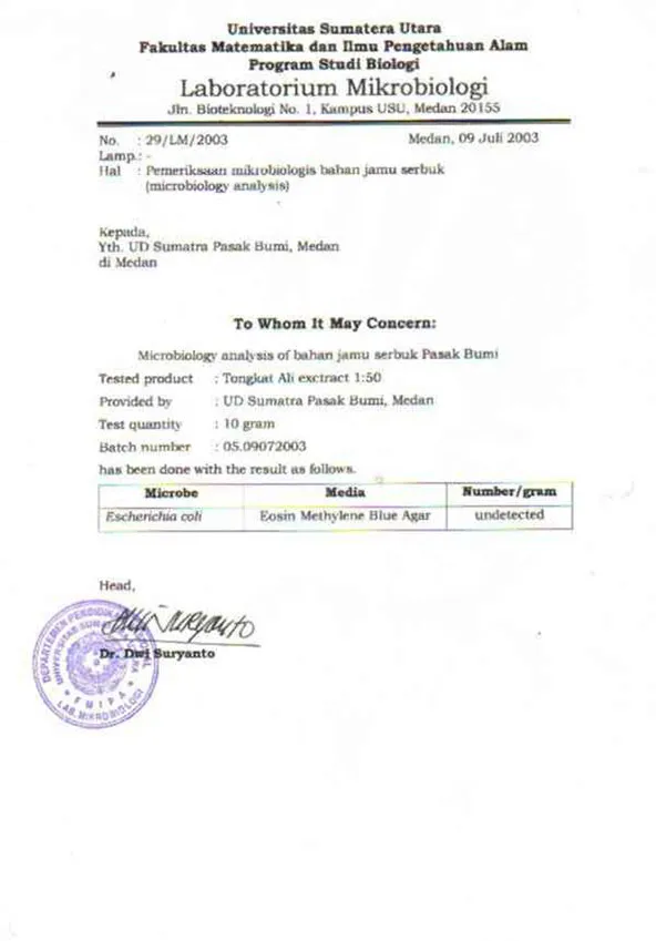 Certificate of Analysis on E. Coli, USU, Medan, Indonesia