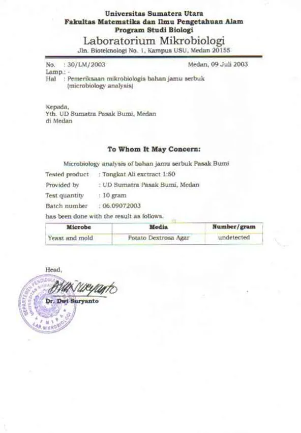 Certificate of Analysis on Fungi, USU, Medan, Indonesia