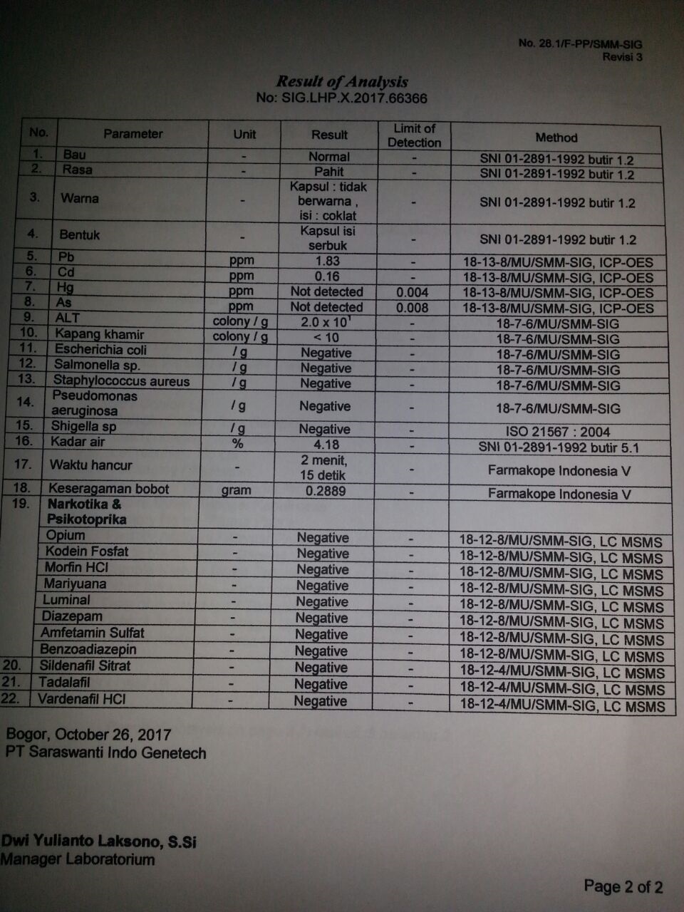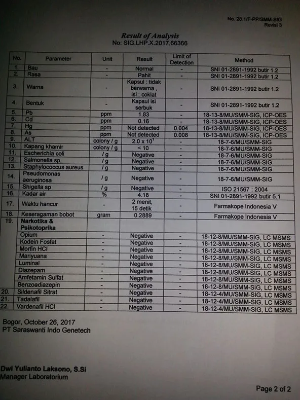 Certificate of Analysis, Page 2, PT. Saraswanti Indo Genetech, Bogor, Indonesia