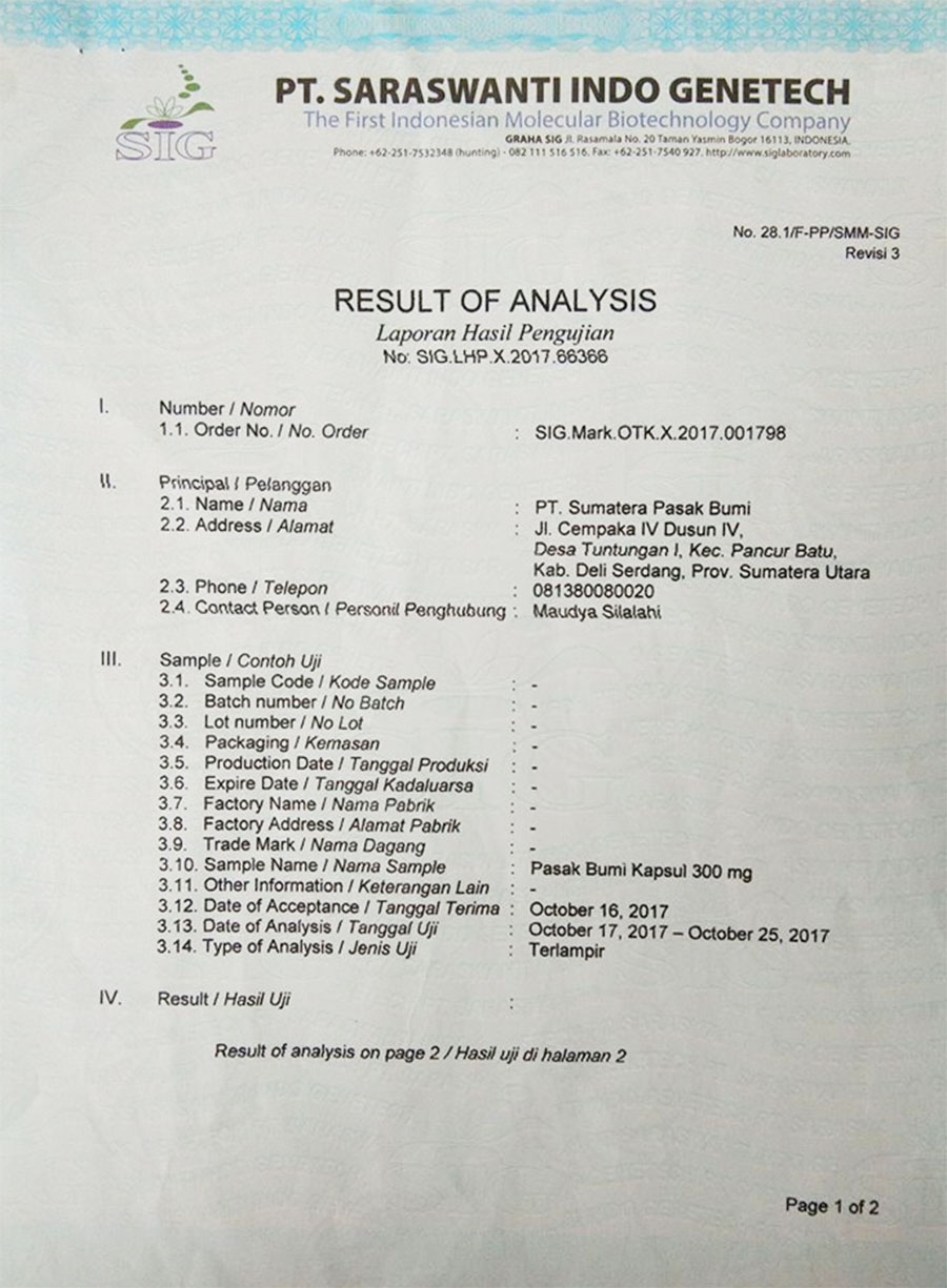 Certificate of Analysis, Page 1, PT. Saraswanti Indo Genetech, Bogor, Indonesia
