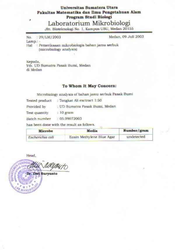 Certificate of Analysis on Coli, Certified Laboratories, Bogor, Indonesia