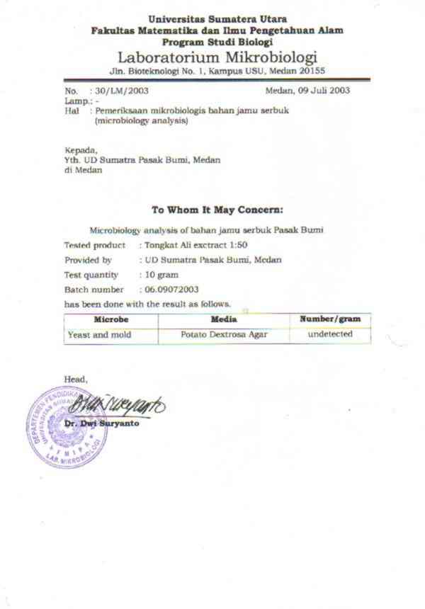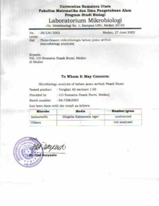 Certificate of Analysis on Fungi, Certified Laboratories, Bogor, Indonesia