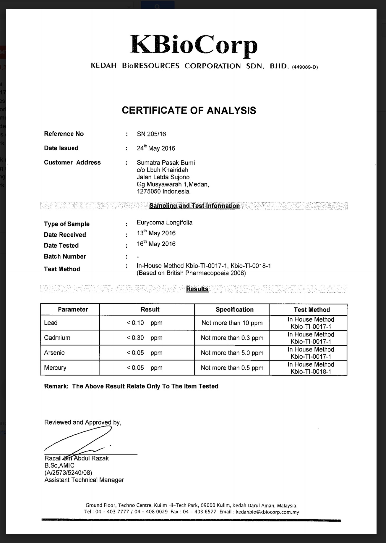 Certificate of Analysis on Heavy Metals, KBioCorp, Kedah, Malaysia