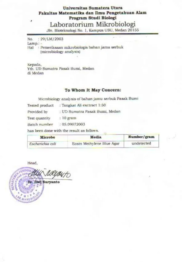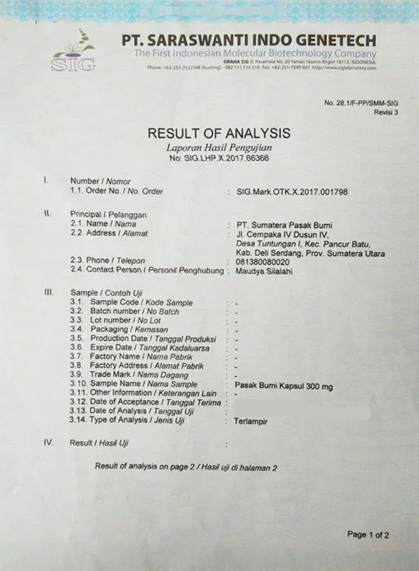 分析証明書 第1ページ — PT. Saraswanti Indo Genetech(インドネシア・ボゴール)