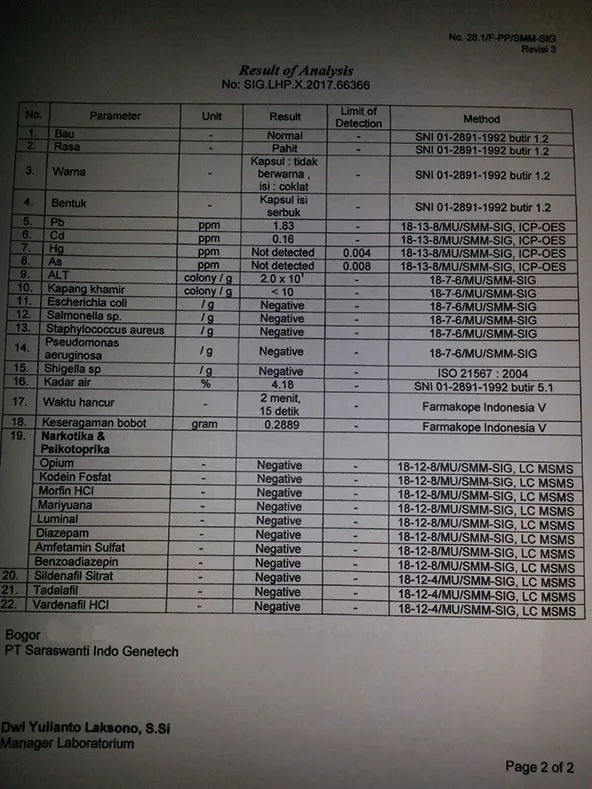 分析証明書 第2ページ — PT. Saraswanti Indo Genetech(インドネシア・ボゴール)